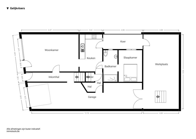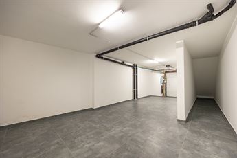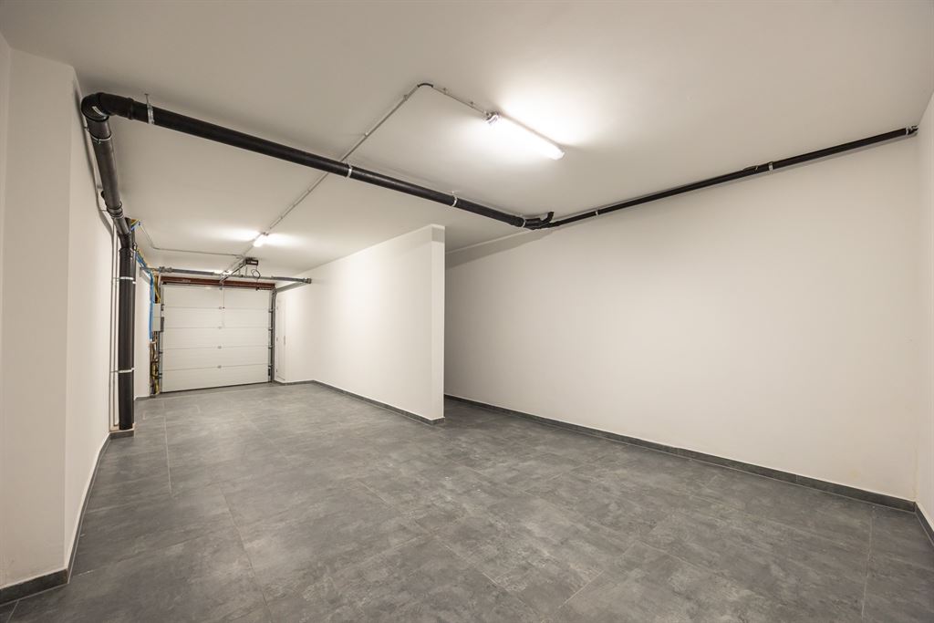 Op het gelijkvloers van de woning vind je een ruime inpandige garage van 42 m² met nieuwe automatische poort, betegelde vloer en extra bergruimte onder de trap. Je kan hier makkelijk je auto kwijt en dan nog heb je meer dan plaats genoeg voor fietsen, gereedschap of andere spullen. Evengoed geef je het een andere invulling als atelier, speelkamer of work out room.