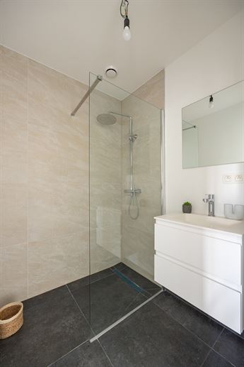 Op de tweede verdieping ligt de ruime master bedroom (18 m²) en aansluitende badkamer met walk in regendouche en wastafel. Ook hier trekken de beige wandtegels en de donkere vloer de moderne lijn door. Daarnaast vind je op deze verdieping nog een gezellige, lichtrijke leefruimte aan de voorzijde van het huis.