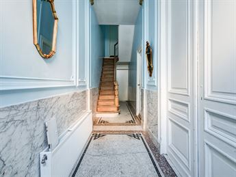 Achter de prachtige gevel met z’n groene ramen en mozaïeken, bevindt zich dit fijne appartement vol charme. Dat voel je al meteen wanneer je de gemeenschappelijke inkomhal binnenstapt: een prachtige authentieke mozaïekvloer, marmeren wandpanelen; hoge plafonds met sierlijsten en een afgeschuurde houten trap. Dit pand ademt één en al elegantie!