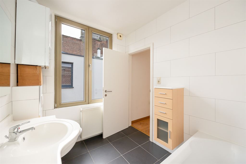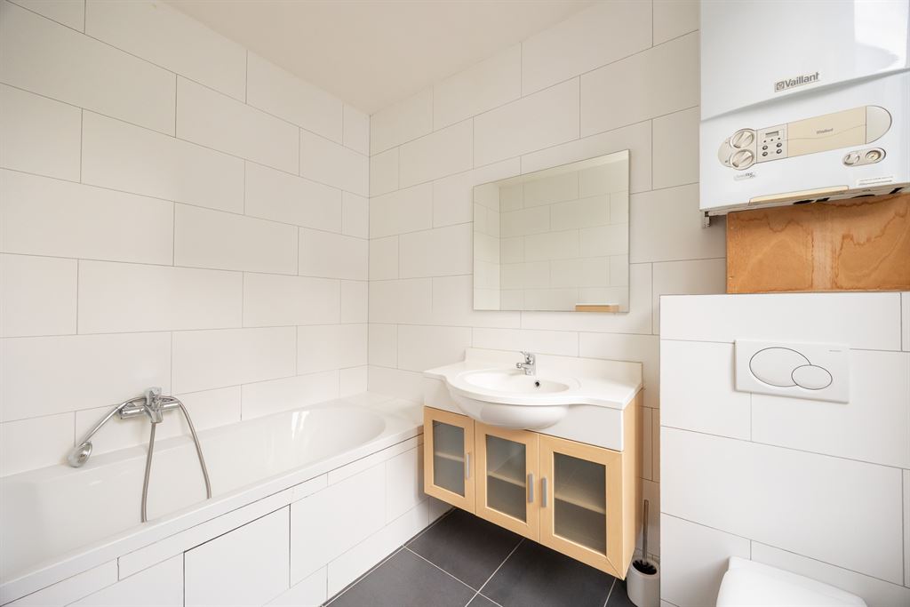 Aan de rustige achterzijde bevindt zich de slaapkamer met aansluitend de volledig betegelde badkamer, waar je een ligbad met douchevoorziening, een grote lavabo met meubel, een spiegel en een hangtoilet hebt. Je trekt hier ook veel daglicht en frisse lucht binnen dankzij het raam.