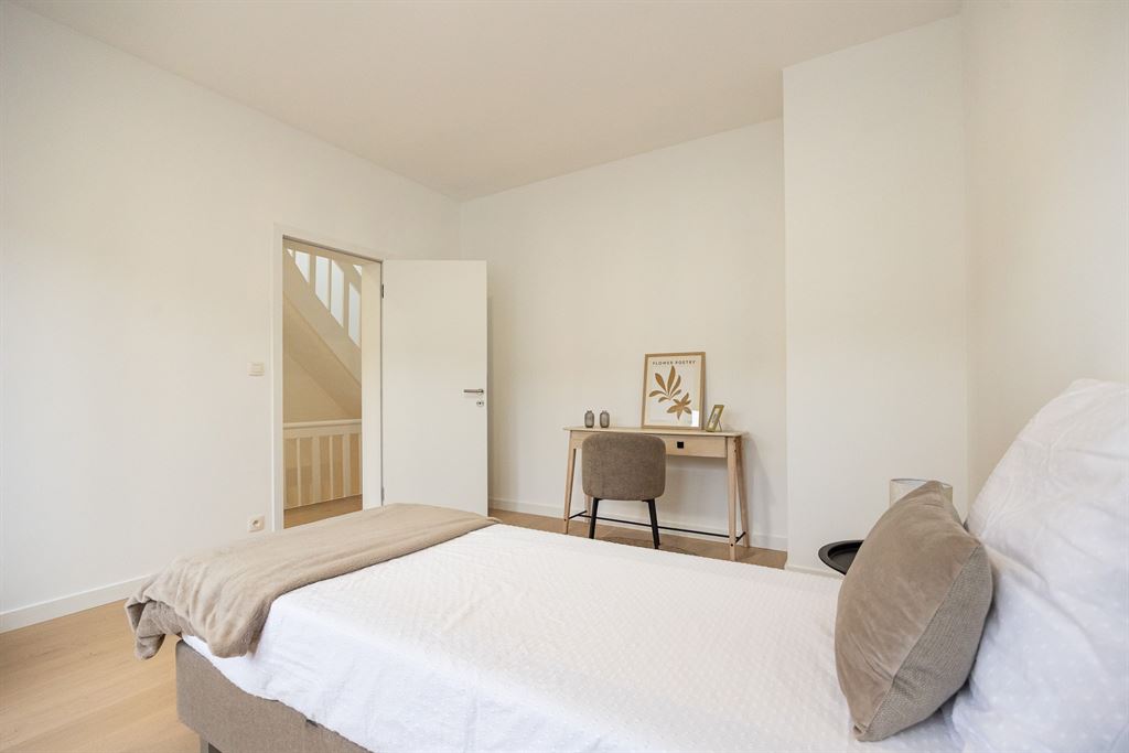Op de eerste verdieping bevinden zich twee ruime slaapkamers, een apart toilet, een badkamer met ligbad én douche, en een grote wasruimte. De master bedroom heeft aansluitend een dressing en ensuite badkamer met XL-tegelvloer, ligbad, douche, dubbele lavabo en handdoekradiator. De tweede verdieping herbergt nog drie slaapkamers. Hier vind je ook een tweede badkamer met douche en een derde toilet. Alles afgewerkt met dezelfde warme parketvloer en veel licht.
