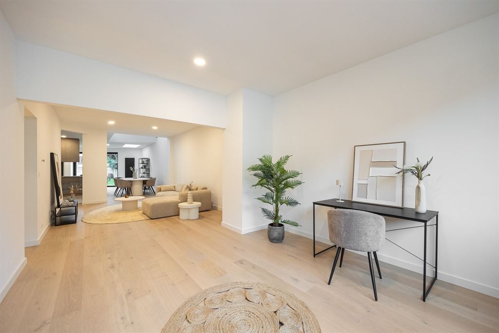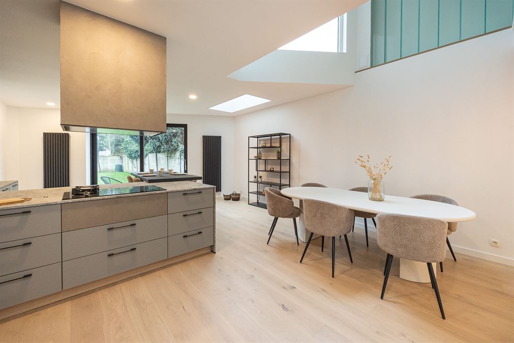 Je komt binnen in een stijlvolle inkomhal met parketvloer en toegang tot een aparte technische ruimte met vestiairahoek en gastentoilet. Uniek is de dubbele toegang tot de leefruimte, waardoor je vooraan makkelijk een praktijkruimte of bureau kan inrichten. Verder door stap je in een gigantische leefruimte met open keuken, waar de hoge plafonds (5,7m!) en vide meteen in het oog springen. De keuken is hypergeïnstalleerd, met een combinatie van inductie- én gasvuur, dampkap, ijskast, diepvries, vaatwasser, twee combi-ovens en veel opbergruimte. Via de schuifdeur kom je in de aangelegde, ruime tuin van maar liefst 140 m² – een zeldzaam pluspunt in de stad.