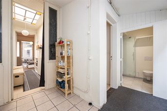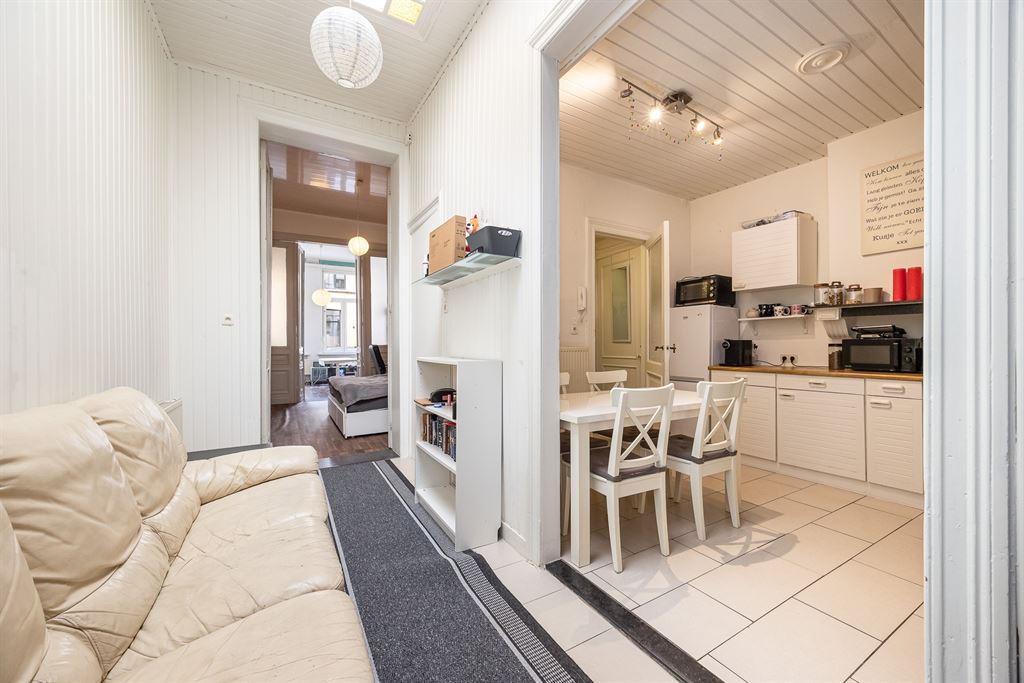 Je komt binnen in de inkomhal op tegelvloer, met plaats voor jassen en schoenen. Van hieruit stap je meteen de keuken binnen, praktisch ingericht met dubbele spoelbak, gasvuur, dampkap en voldoende kastruimte. Aansluitend vind je de badkamer, die netjes werd vernieuwd met een moderne douchecabine, lavabomeubel, spiegelkast en toilet. Achteraan bevindt zich de veranda, een polyvalente ruimte met zicht op de stadskoer — een aangename plek om te genieten van een koffietje in de zon.