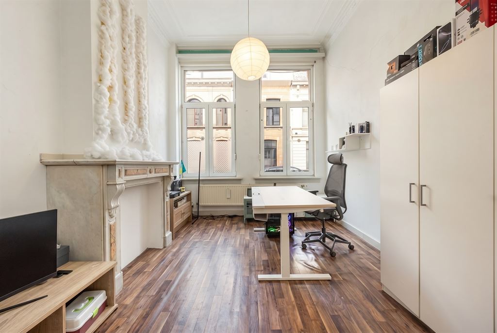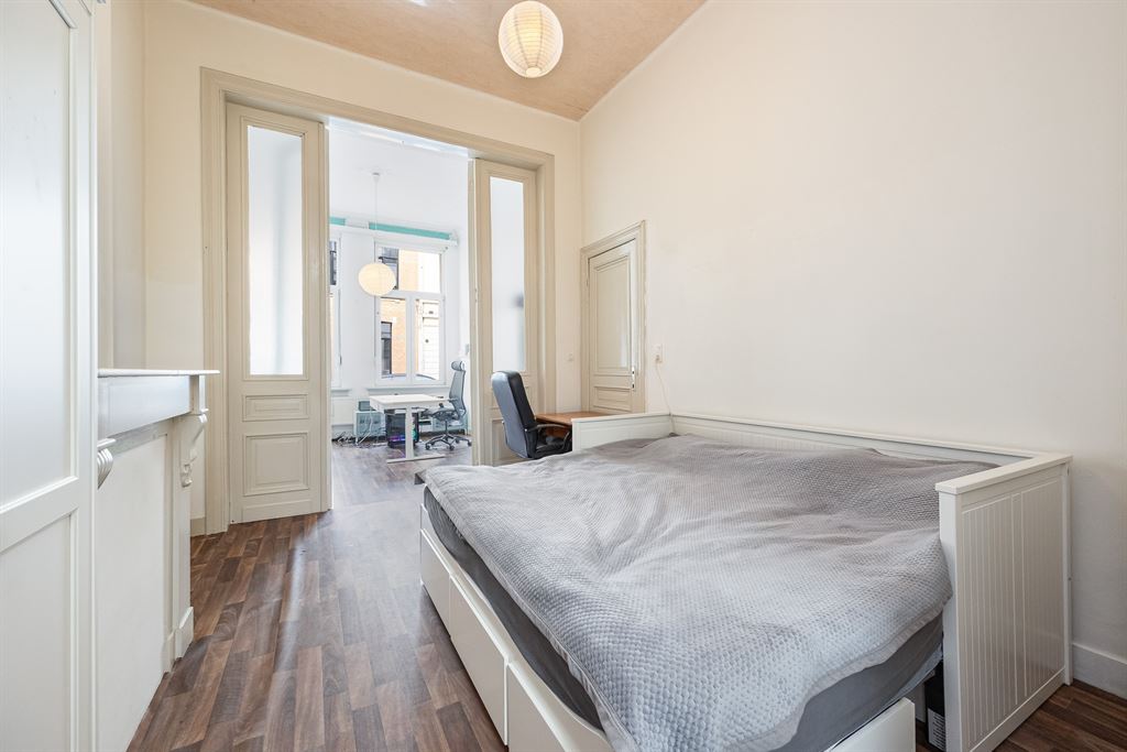 De huidige indeling voorziet rechts van de keuken een zithoek, slaapkamer en bureau. Deze indeling kan je eenvoudig optimaliseren: maak van de bureauruimte aan de straatzijde een volwaardige slaapkamer en richt de huidige slaapkamer in als leefruimte.