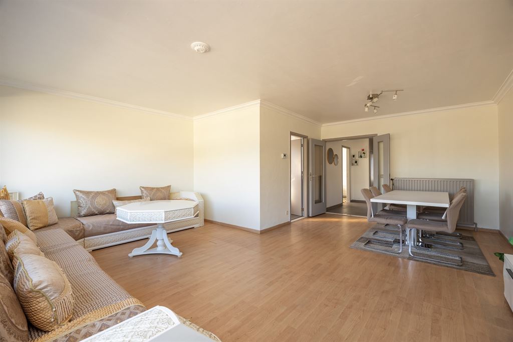 Je bereikt het appartement op de derde verdieping van het gebouw. In de inkomhal, afgewerkt met een grijze tegelvloer, bevinden zich meteen enkele ingemaakte kasten voor jassen en schoenen, evenals een parlofoon. Deze hal vormt de centrale spil van het appartement en biedt toegang tot alle ruimtes. Links kom je in de ruime woonkamer met laminaatvloer. Dankzij de kamerbrede ramen aan de voorzijde geniet deze ruimte van bijzonder veel natuurlijk licht. Bovendien is er hier meer dan voldoende plaats voor een gezellige zithoek en een grote eettafel. Aansluitend bevindt zich hier de praktische keuken. Deze ligt aan de zijkant van het gebouw en geniet dankzij de hoekligging van het appartement van aangenaam natuurlijk daglicht. De keuken is praktisch ingericht met veel kastruimte en uitgerust met een gasvuur, dampkap, oven/microgolfoven en een dubbele spoelbak. Hier bevindt zich bovendien de aansluiting voor de wasmachine.