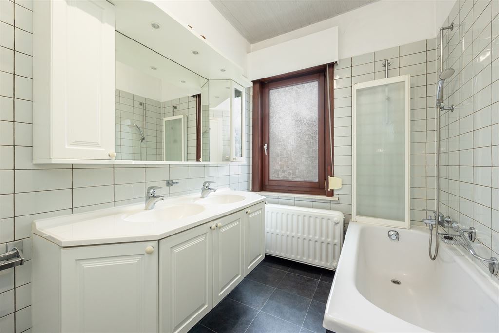 Op de bovenverdieping bevinden zich drie slaapkamers op laminaatvloer: een ruime master van 18 m² aan de achterzijde en twee lichtrijke kamers aan de straatkant, beide voorzien van rolluiken. De volledig betegelde badkamer is uitgerust met een ligbad, dubbele lavabo, ventilatie, een extra toilet en een badkamermeubel met boven- en zijkasten.