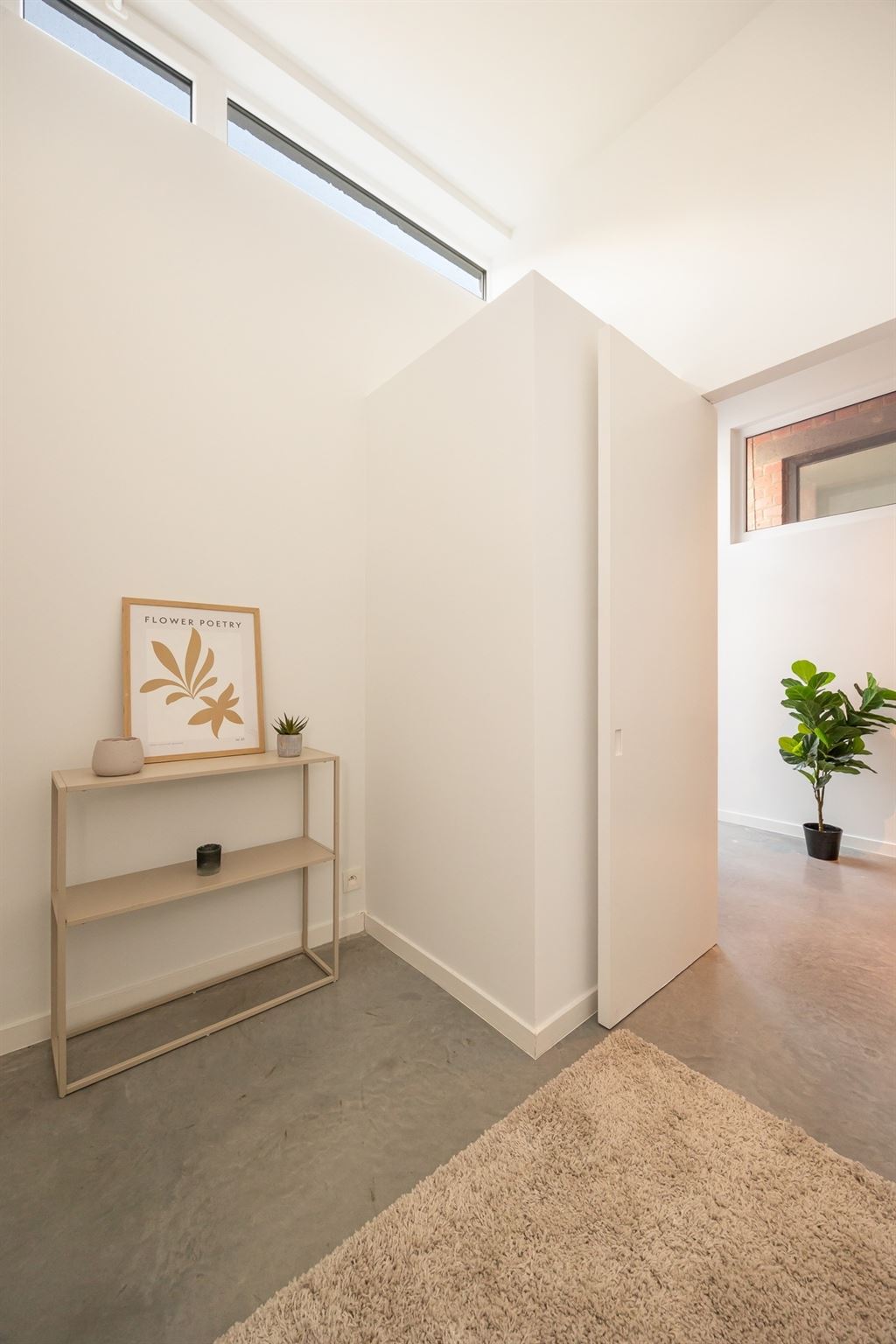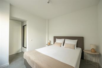 Achteraan het appartement bevinden zich twee slaapkamers. De grootste slaapkamer kijkt uit op de gezellige stadstuin en is heerlijk rustig. De tweede kamer is perfect als bureau, dressing of kinderkamer. Beide kamers en de nachthal zijn afgewerkt met een gietvloer in betonlook. De badkamer is compact maar kwalitatief ingericht, met een inloopdouche met regendouche, een lavabomeubel met twee lades, handdoekdroger en ventilatiesysteem. Alles werd smaakvol en praktisch aangepakt.