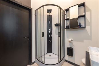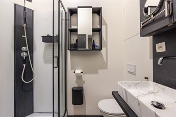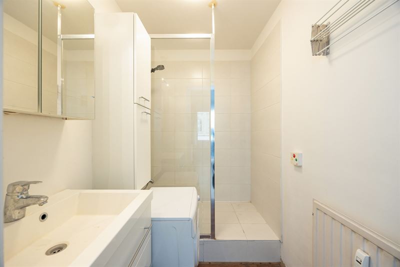 De badkamer is compact maar slim ingericht en voorzien van een moderne douche, lavabo en toilet. De tegelvloer maakt het praktisch en onderhoudsvriendelijk. Handig detail: de aparte wasplaats met aansluiting voor wasmachine bevindt zich vlak ernaast.