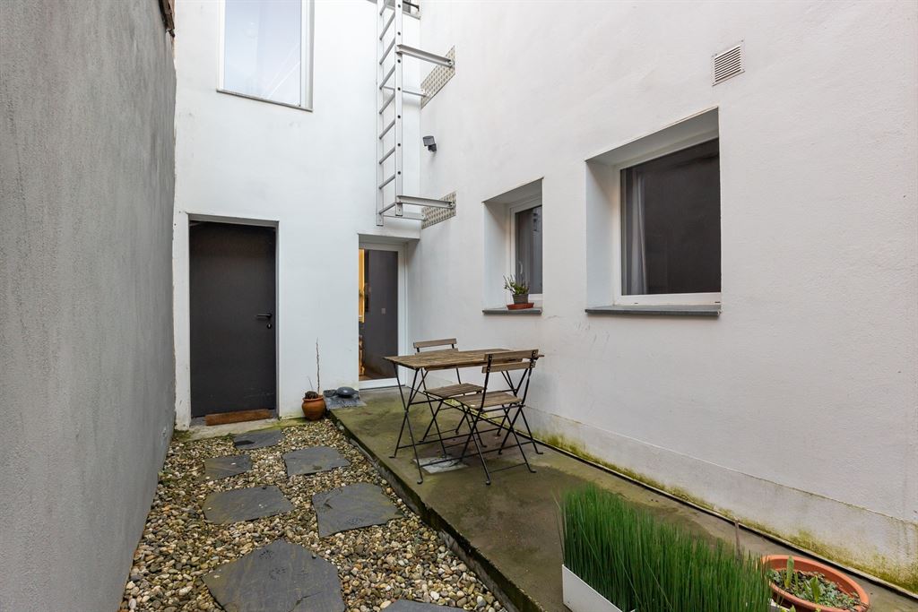 Achteraan ligt de ruime slaapkamer, weg van de straatkant, met voldoende plaats voor een dubbel bed en kleerkasten. Dankzij de ligging aan de koer geniet je hier van extra rust. De private buitenruimte is perfect voor een koffiemoment, een aperitief of enkele plantjes. Compact, onderhoudsvriendelijk en supergezellig.