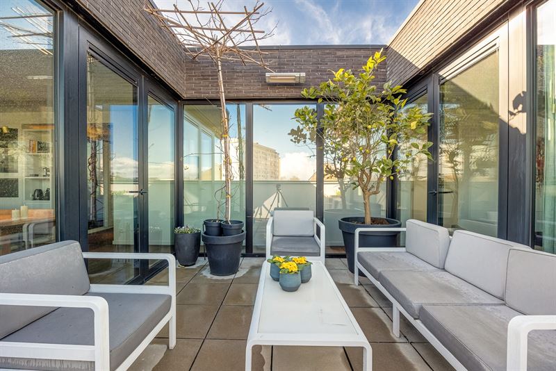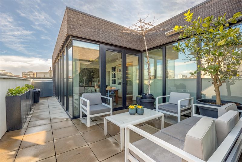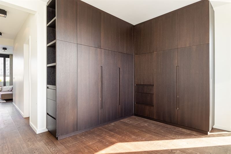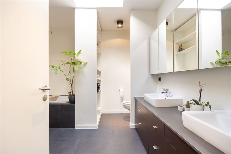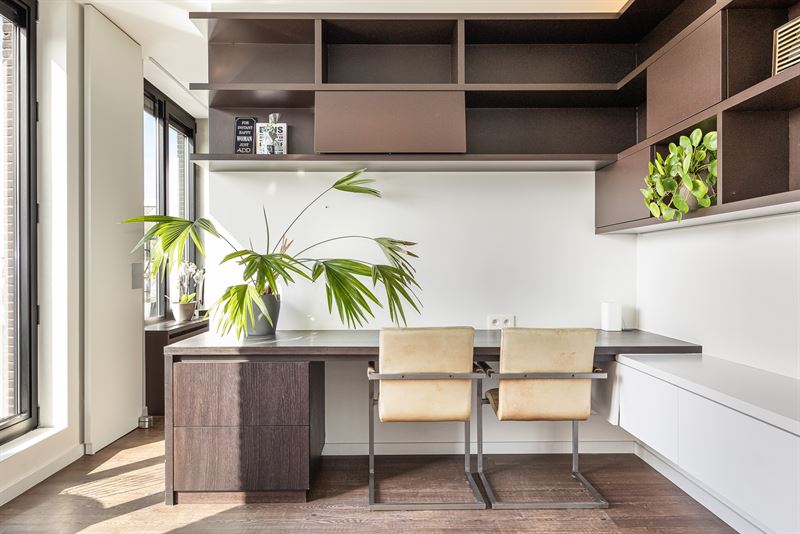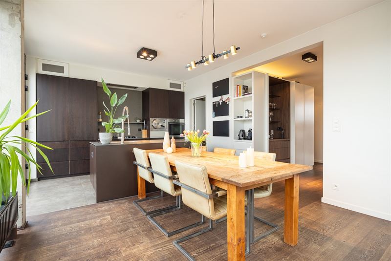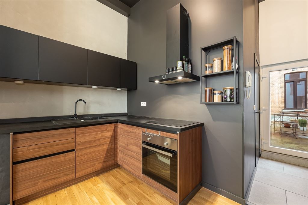 In de leefruimte geniet je meteen van de hoge plafonds en het vele licht dat binnenvalt via de grote ramen. De houten vloer en de zachte tinten creëren een warme, moderne sfeer. Een perfecte leefhoek met ruimte voor een eetplek én cozy zithoek. De open keuken vormt een mooi geheel met de leefruimte. Ze is volledig uitgerust met oven, kookplaat, dampkap, vaatwasser en spoelbak — ideaal voor wie graag kookt. De donkere tinten, houtaccenten en strakke lijnen geven de keuken een stijlvolle uitstraling. Vanuit de keuken stap je via de achterdeur naar het terras.