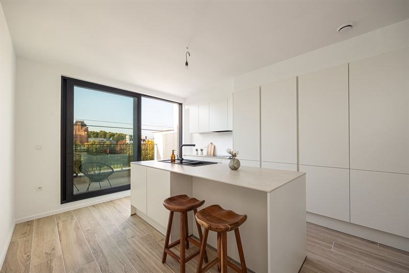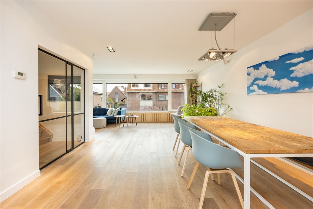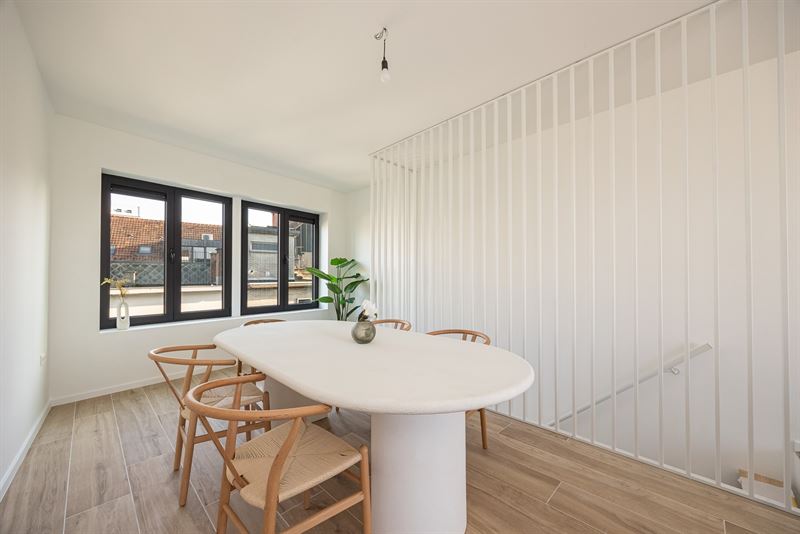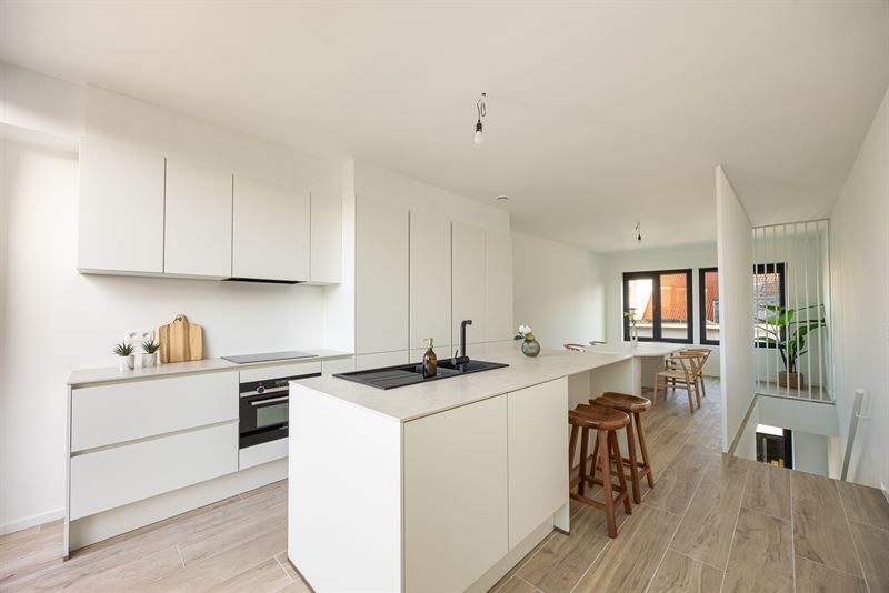 De eerste verdieping is zonder twijfel het hart van de woning. Hier vloeien licht, ruimte en comfort moeiteloos in elkaar over. De leefruimte baadt in het daglicht dankzij de grote ramen en voelt extra warm aan door de mooie parketvloer en de strakke afwerking. Aansluitend ligt de open keuken, een echte eyecatcher met haar minimalistische witte design, composieten werkblad en kwalitatieve toestellen. Hier kook je met zicht op buiten én in verbinding met je gasten.