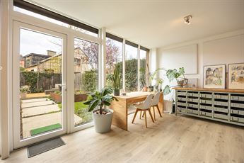 Vanuit de keuken stap je zo het terras op – perfect voor een aperitiefje in de zon – met een open zicht op de tuin.