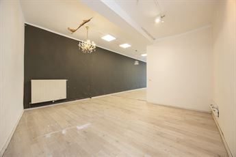 De ruimte zelf is bijzonder ruim en open, afgewerkt met een lichte laminaatvloer en hoge plafonds van maar liefst 3,3 meter. Dit geeft niet alleen een aangenaam ruimtelijk gevoel, maar biedt ook praktische voordelen voor inrichting, stockage of creatieve invulling. Achteraan is er voldoende plaats voorzien om eventueel een keuken of werkruimte te installeren, volledig naar eigen noden en concept.