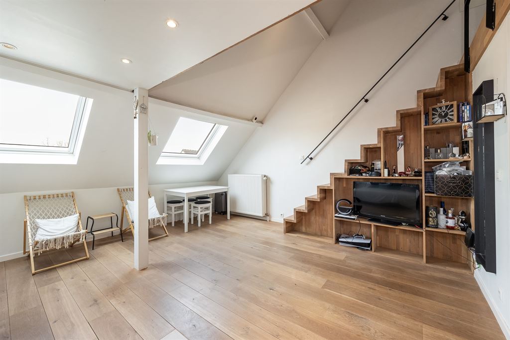 Bij het binnenkomen valt meteen de openheid en het ruimtegevoel op. De leefruimte en keuken vloeien naadloos in elkaar over, met een mooie combinatie van een warme parketvloer en onderhoudsvriendelijke tegels in de keuken. Er is voldoende plaats voor zowel een gezellige eethoek als een comfortabele zithoek, en dankzij de grote veluxramen geniet je hier van veel natuurlijk licht. De keuken is volledig uitgerust met oven, kookplaat, dampkap, vaatwasser en koelkast met diepvries. Dankzij de strakke afwerking en het praktische ontwerp is dit een fijne plek om te koken én te genieten.