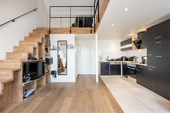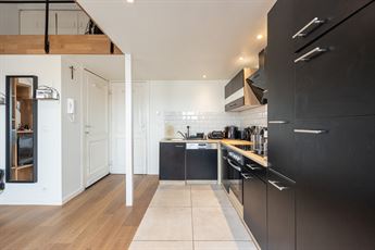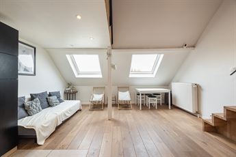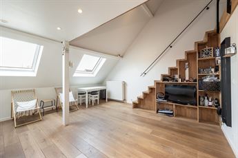 Via de knappe, geïntegreerde trap bereik je de mezzanine, ingericht als slaapkamer en afgewerkt met een warme parketvloer. Deze verdieping geeft het appartement een speelse, loftachtige uitstraling. De open structuur zorgt voor een aangenaam ruimtegevoel, terwijl de dakramen zorgen voor een overvloed aan natuurlijk licht. Hier kom je helemaal tot rust.