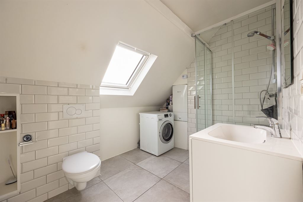 Aansluitend bevindt zich de badkamer, afgewerkt met grote grijze XL-tegels en stijlvolle metrotegels tegen de muur. Deze is voorzien van een douchecabine, lavabo met opbergruimte, aansluiting voor wasmachine en droogkast en een hangtoilet. Alles is compact maar doordacht ingericht, met oog voor comfort en extra lichtinval via het veluxraam.