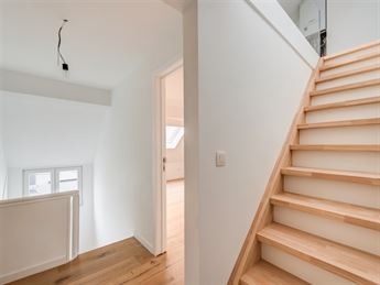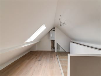 Via een vaste trap bereiken we de bovenste verdieping, die polyvalent kan worden ingericht als extra logeerkamer, hobby‑ of bureauruimte. Hier bevinden zich ook de technische installaties, waaronder de CV‑ketel en de aansluitingen voor was‑ en droogmachine.