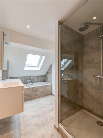 Op de verdieping hoger bevinden zich twee ruime slaapkamers, beide voorzien van volhouten parket en Velux‑ramen. Vanuit beide kamers is de badkamer toegankelijk, die uitgerust is met een betegelde douche, ligbad, groot dubbel lavabomeubel met schuiven en spiegelkast met extra opbergruimte. Op deze verdieping is eveneens een apart toilet voorzien.
