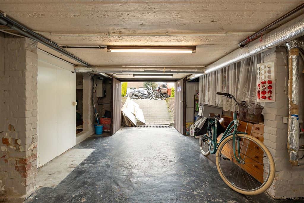 Ondergronds bevindt zich de inpandige garage, toegankelijk via de oprit of via de trap vanuit de inkomhal. Dankzij de oprit kan de garage perfect gebruikt worden als multifunctionele ruimte — bijvoorbeeld als atelier of hobbyruimte — en niet louter voor het parkeren van een wagen. Handig is ook dat de aansluiting voor was- en droogtoestellen hier voorzien is, netjes uit het zicht.