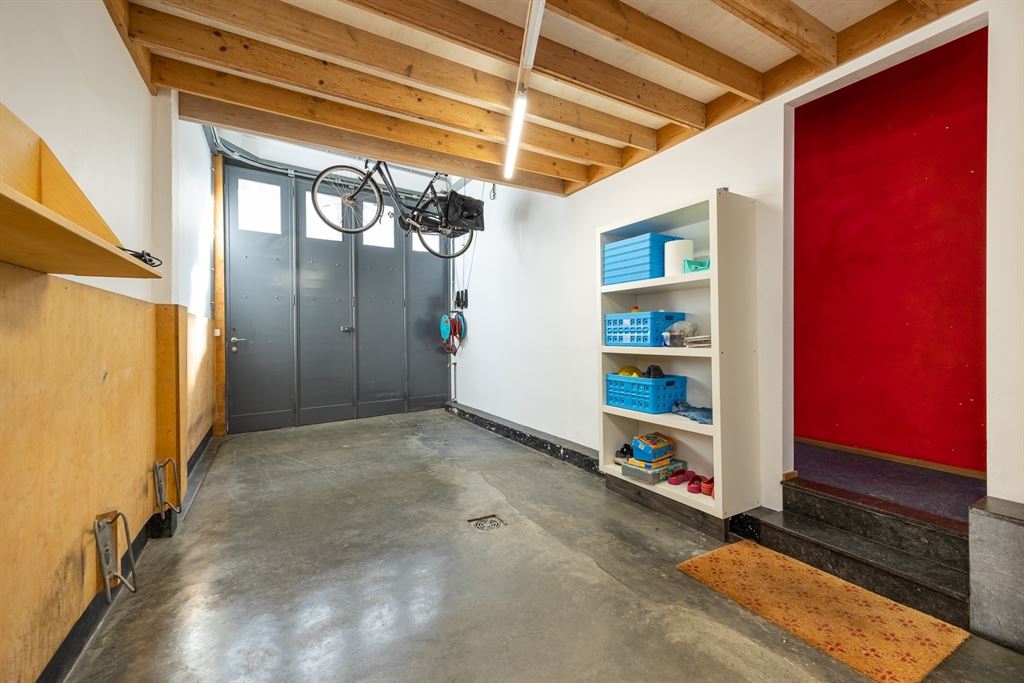 De inpandige garage heeft een indrukwekkende poorthoogte van 3,3 meter en een breedte van 3 meter — perfect voor wagen én fietsen. Via de garage bereik je de ruime, droge kelder én het achterliggende atelier.