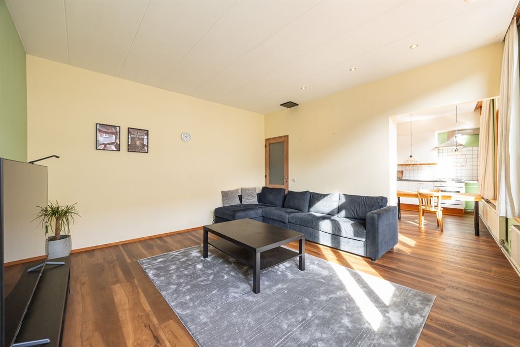 Op de eerste verdieping ontvouwt zich het hart van de woning: een open keuken met leefruimte van maar liefst ca.59 m². De keuken is hoogwaardig afgewerkt met een massief stenen werkblad, inductievuur, oven, microgolf, vaatwasser, glazen spatwand en overvloedige kastruimte. Alles sluit naadloos aan bij het maatwerk en de warme houtaccenten die doorheen de woning zijn doorgetrokken (renovatie van deze verdieping in 2021).  Aansluitend bevindt zich de zitruimte met kachel — open verbonden, maar toch gezellig afgescheiden.