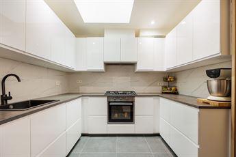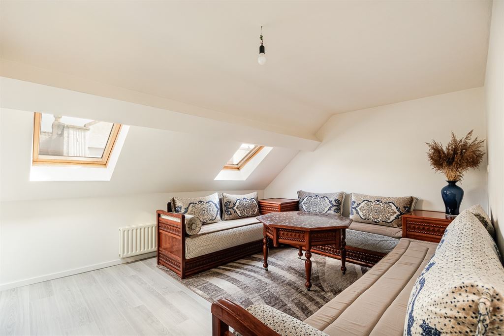 Achteraan bevindt zich de volledig vernieuwde keuken, uitgevoerd in een tijdloos design met witte greeploze kasten en een donker werkblad. Je beschikt hier over kwalitatieve toestellen, waaronder een 5-pits gasfornuis, oven, vaatwasser en Smeg koelkast en diepvries. De elektrische lichtkoepel zorgt voor extra daglicht, wat deze ruimte bijzonder aangenaam maakt om te koken en te leven.