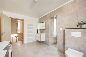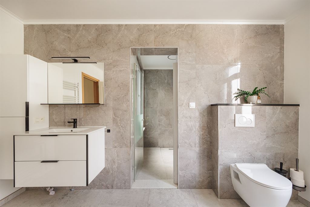Op de eerste verdieping geeft de nachthal toegang tot twee volwaardige slaapkamers en een uitzonderlijk ruime badkamer. Deze is uitgerust met een grote inloopdouche, een tweede toilet, een lavabomeubel en aansluitingen voor was- en droogmachine, netjes verwerkt in maatkasten.