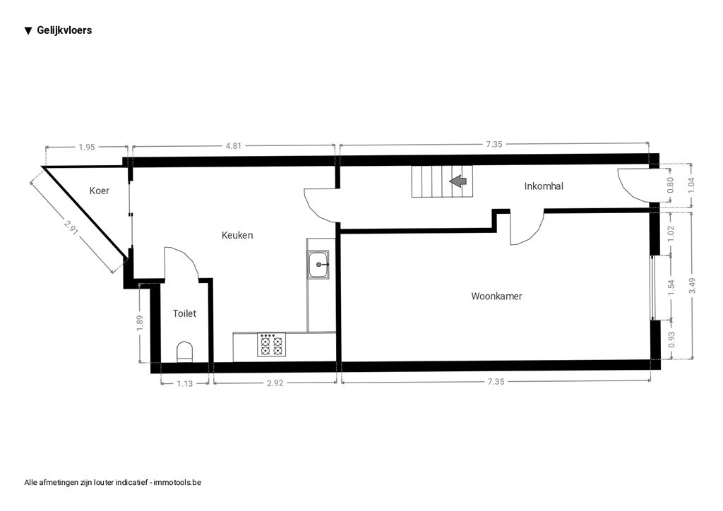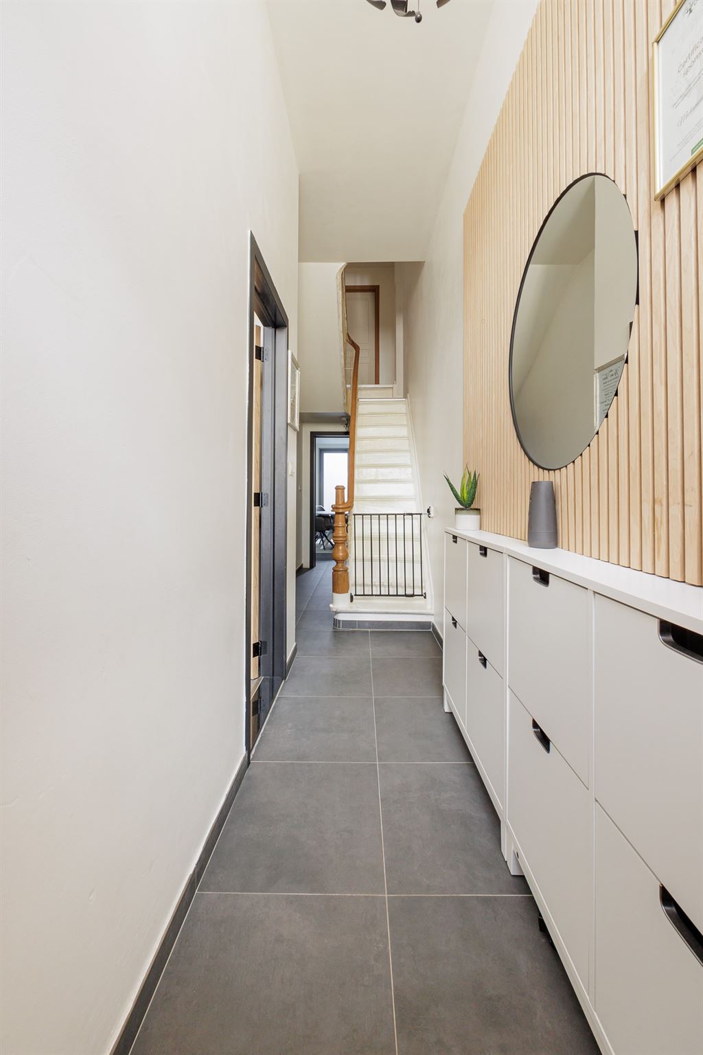 Via de inkomhal, afgewerkt met een onderhoudsvriendelijke tegelvloer en voorzien van natuurlijk licht, kom je binnen in de woning. Van hieruit heb je toegang tot de ruime leefruimte van ca. 28 m², waar salon en eetplaats mooi in elkaar overvloeien. De grote raampartijen zorgen hier voor een aangename lichtinval en een gezellige sfeer.