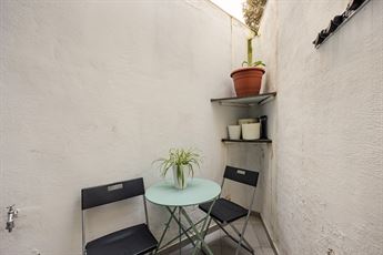 Aansluitend vind je het aparte gastentoilet en de compacte, zuidgerichte koer – ideaal voor een koffietje in de zon.